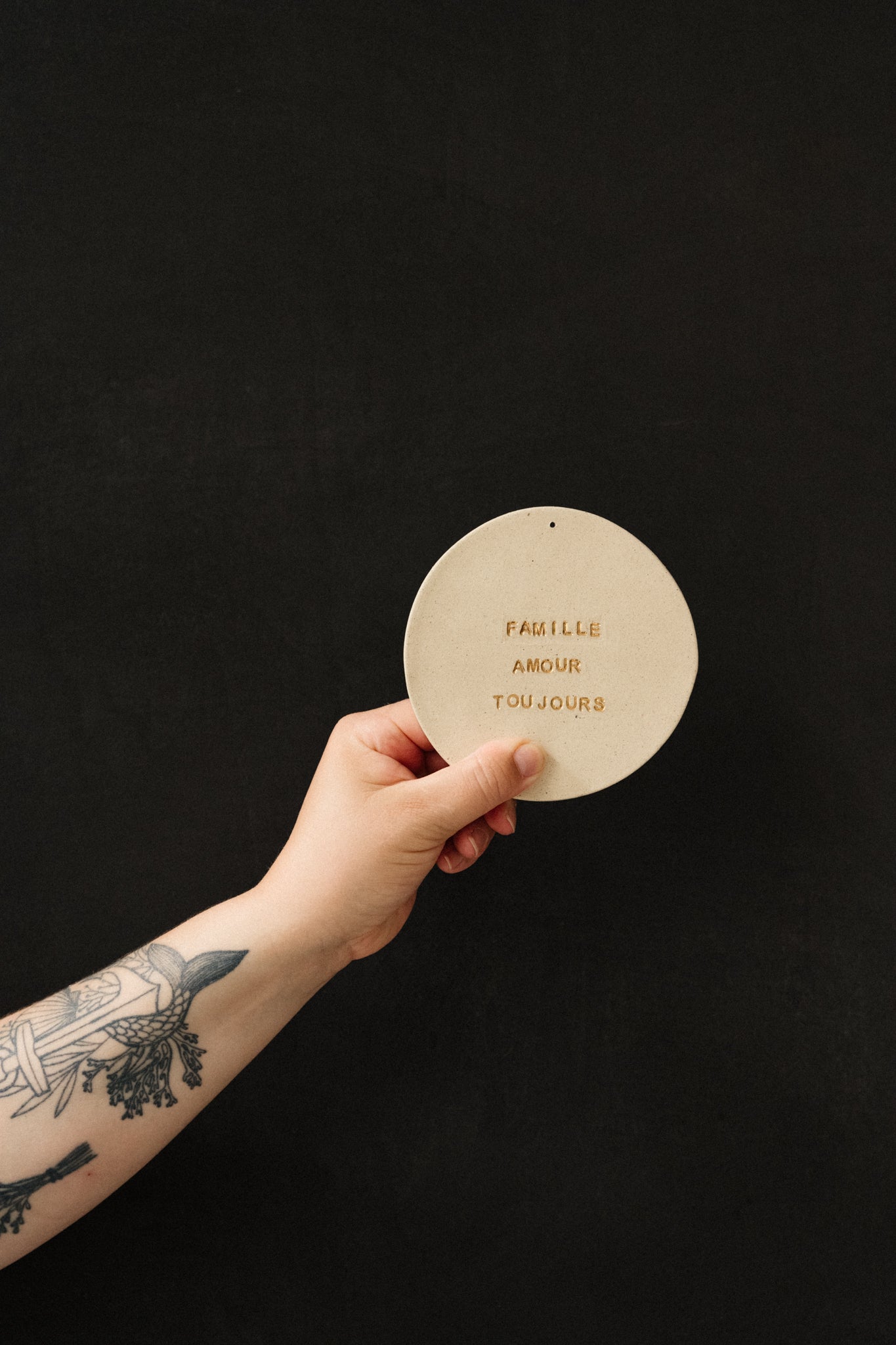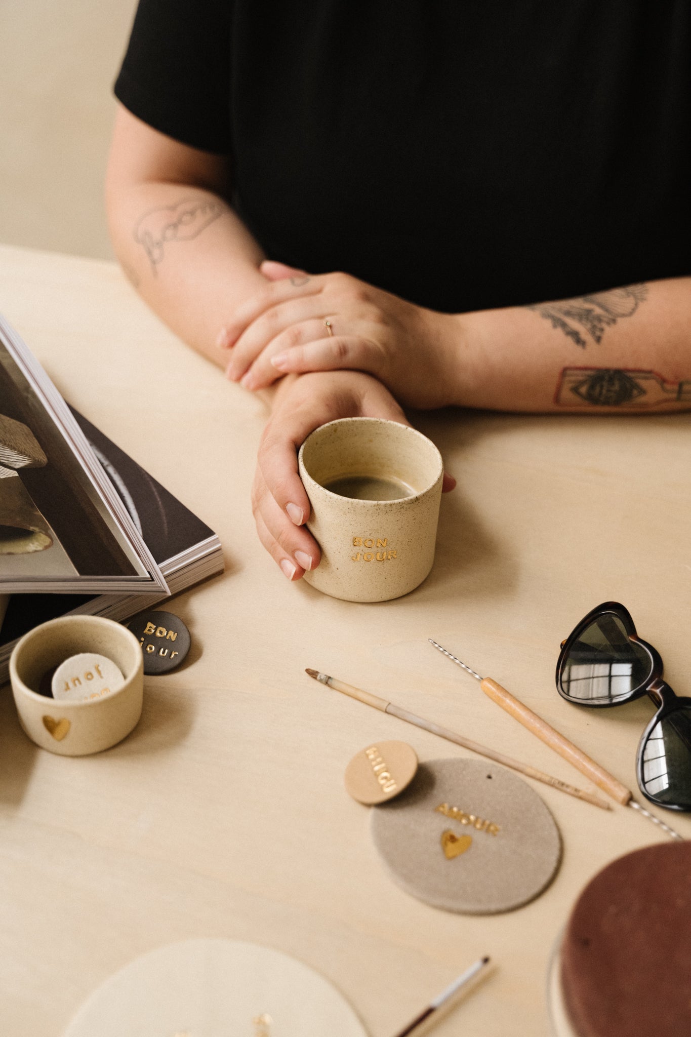 Ode à la vie, ode à l'amour, les créations en céramique PICOTTI PICOTTA sont ponctuées de déclarations réalisées à la main qui peuvent être personnalisées et sont rehaussés d'or !