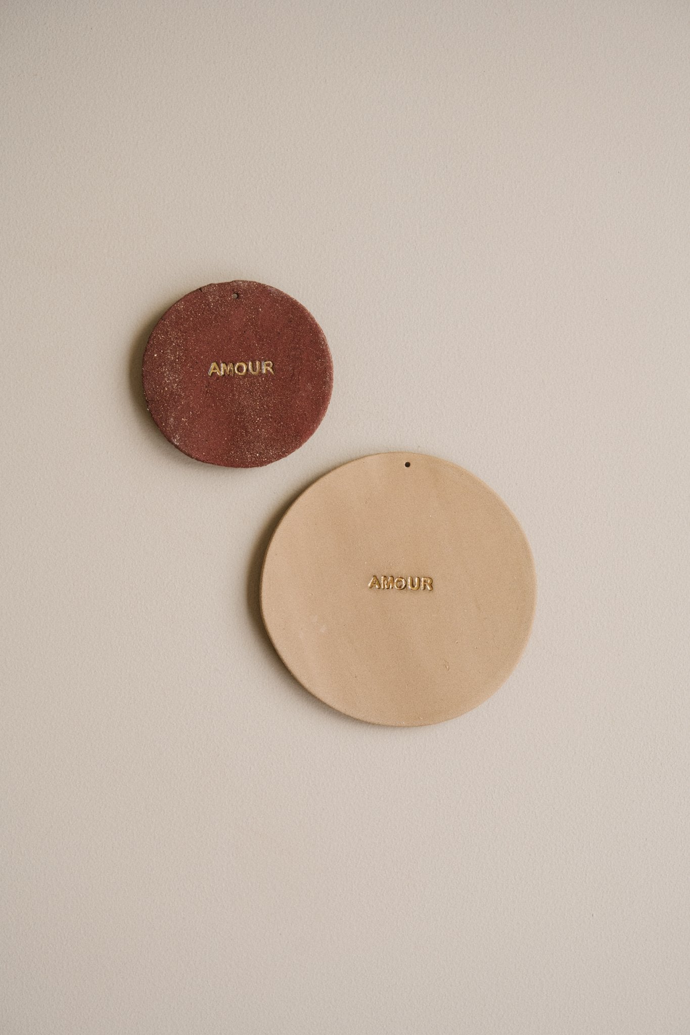 Les lettres sont tatouées par impression sur la terre crue. Après séchage, la pièce part en cuisson à 960°C. Ensuite j’émaille en transparent brillant l’intérieur des lettres pour mettre en avant le contraste du des lettres brillantes et de la plaquette brut. Cuisson à 1260°. Pour finir, je peins à la main le coeur et les lettres à l’or fin et cuits une dernière fois à 800°