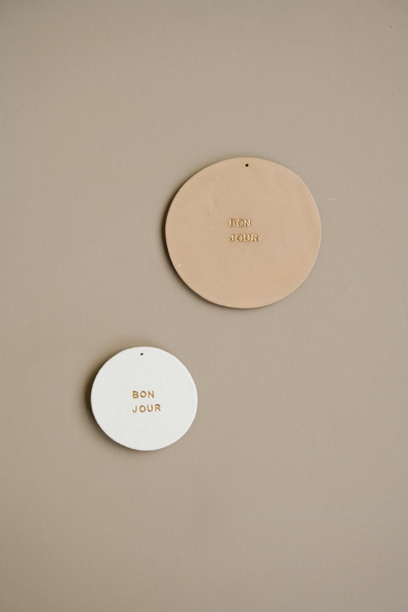 Les lettres sont tatouées par impression sur la terre crue. Après séchage, la pièce part en cuisson à 960°C. Ensuite j’émaille en transparent brillant l’intérieur des lettres pour mettre en avant le contraste du des lettres brillantes et de la plaquette brut. Cuisson à 1260°. Pour finir, je peins à la main le coeur et les lettres à l’or fin et cuits une dernière fois à 800°