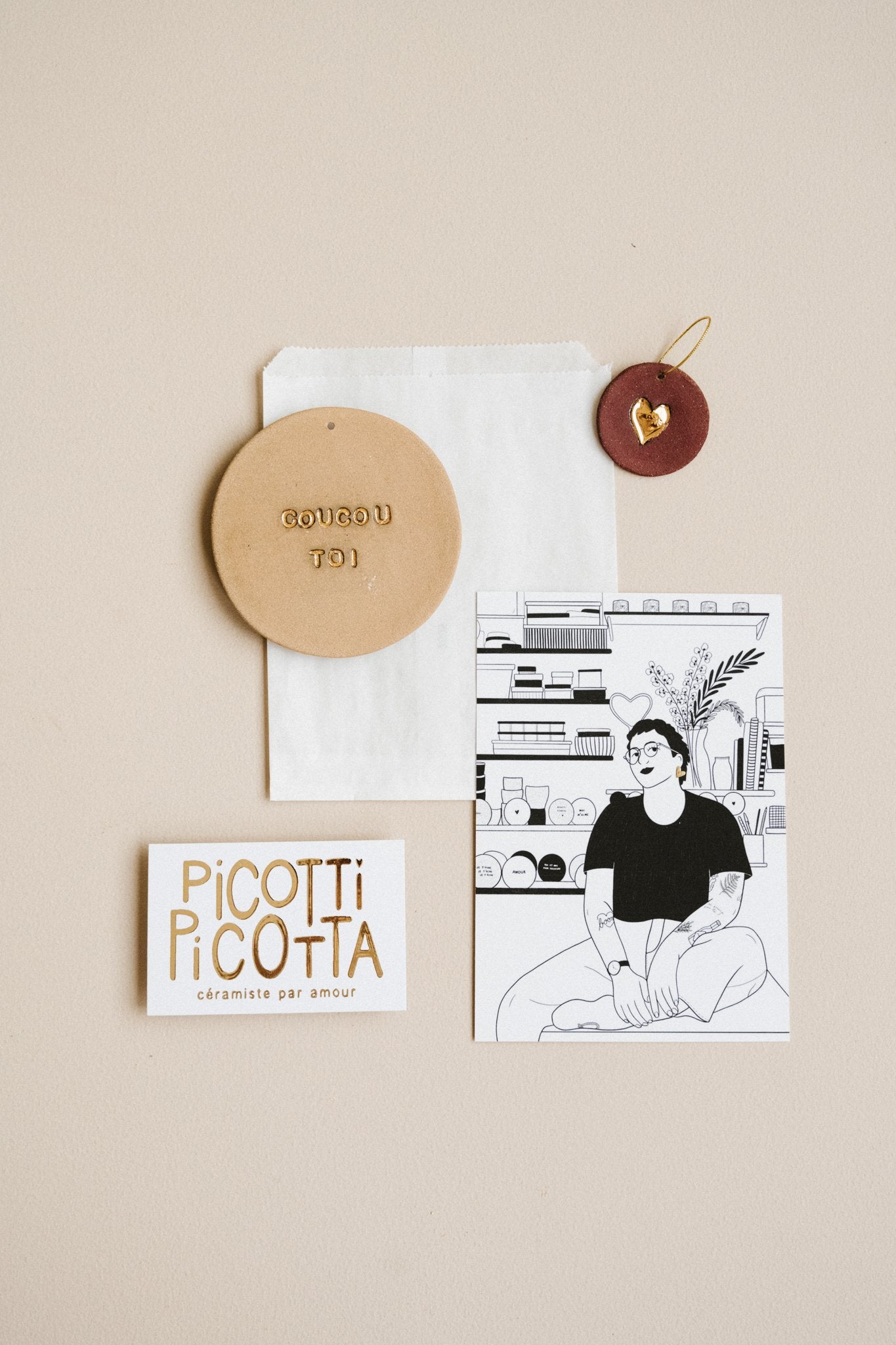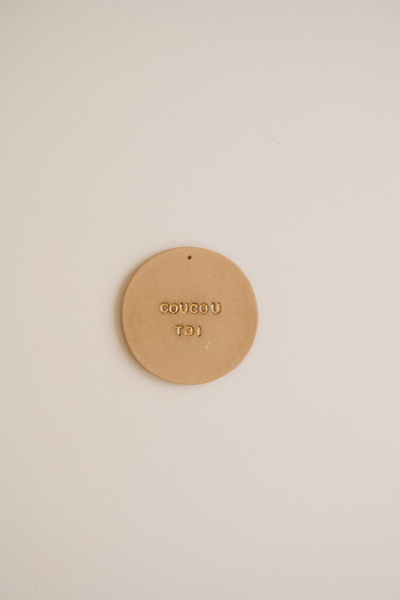 Les lettres sont tatouées par impression sur la terre crue. Après séchage, la pièce part en cuisson à 960°C. Ensuite j’émaille en transparent brillant l’intérieur des lettres pour mettre en avant le contraste du des lettres brillantes et de la plaquette brut. Cuisson à 1260°. Pour finir, je peins à la main le coeur et les lettres à l’or fin et cuits une dernière fois à 800°