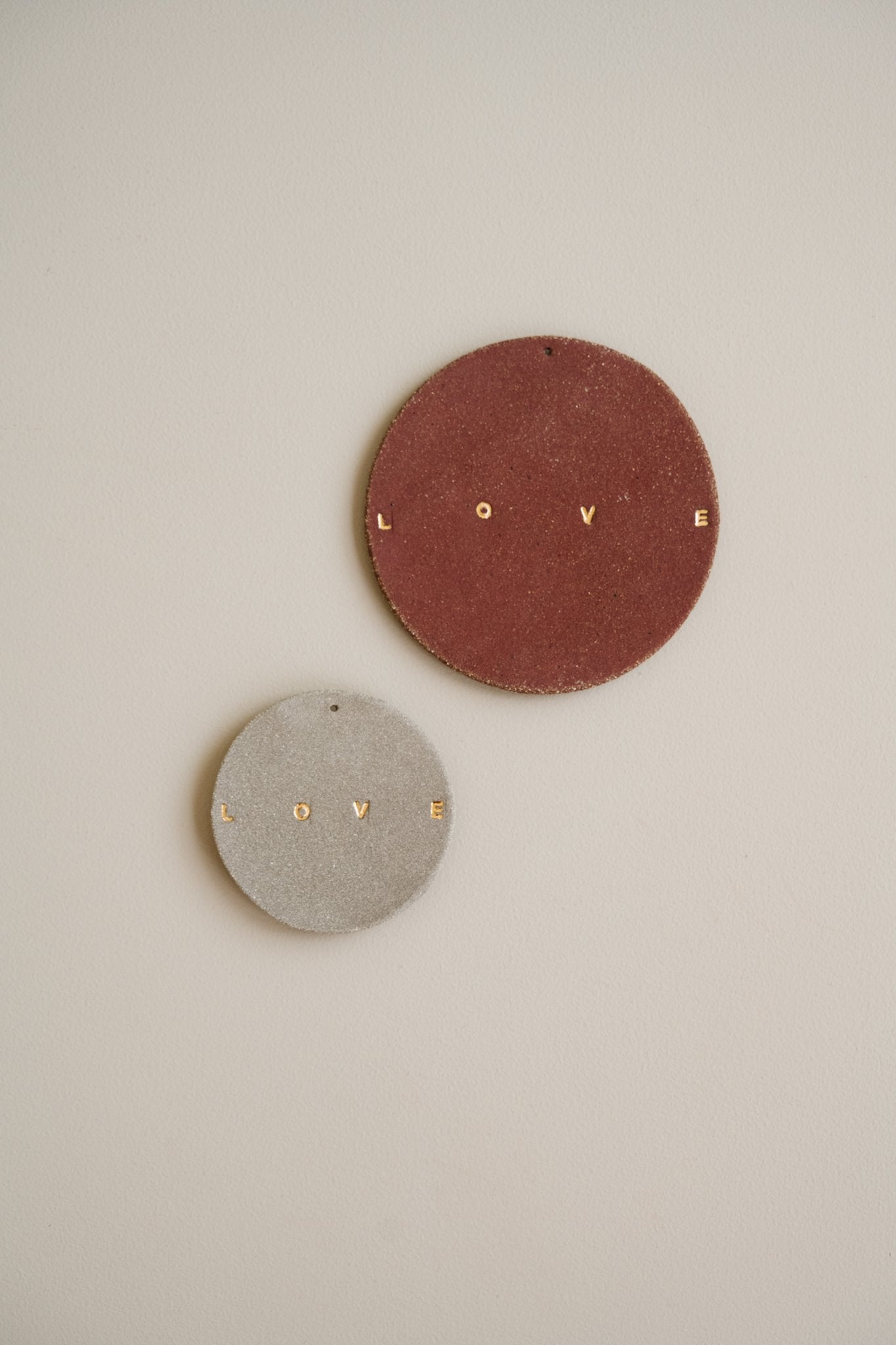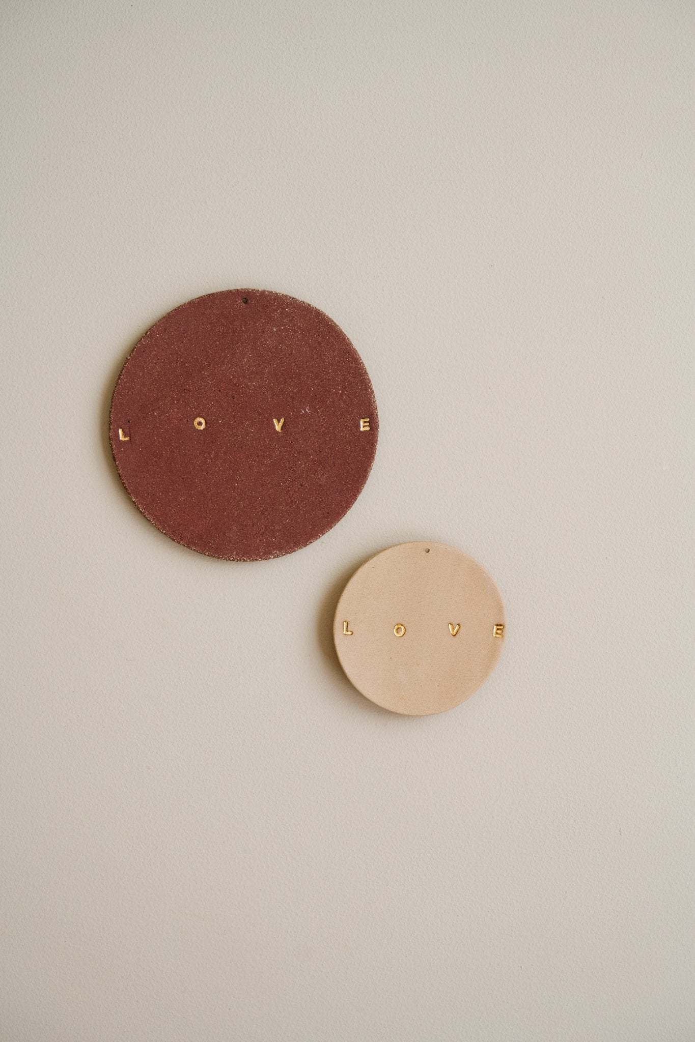 Les lettres sont tatouées par impression sur la terre crue. Après séchage, la pièce part en cuisson à 960°C. Ensuite j’émaille en transparent brillant l’intérieur des lettres pour mettre en avant le contraste du des lettres brillantes et de la plaquette brut. Cuisson à 1260°. Pour finir, je peins à la main le coeur et les lettres à l’or fin et cuits une dernière fois à 800°