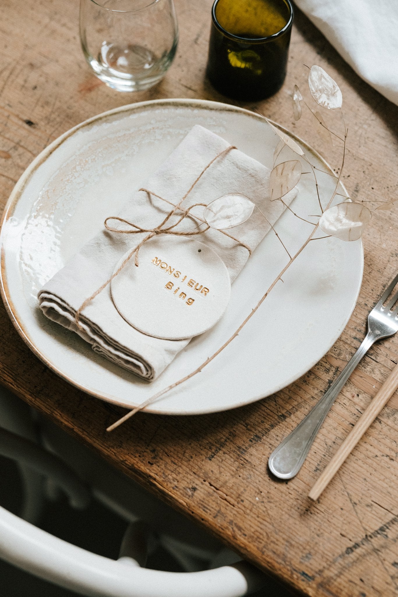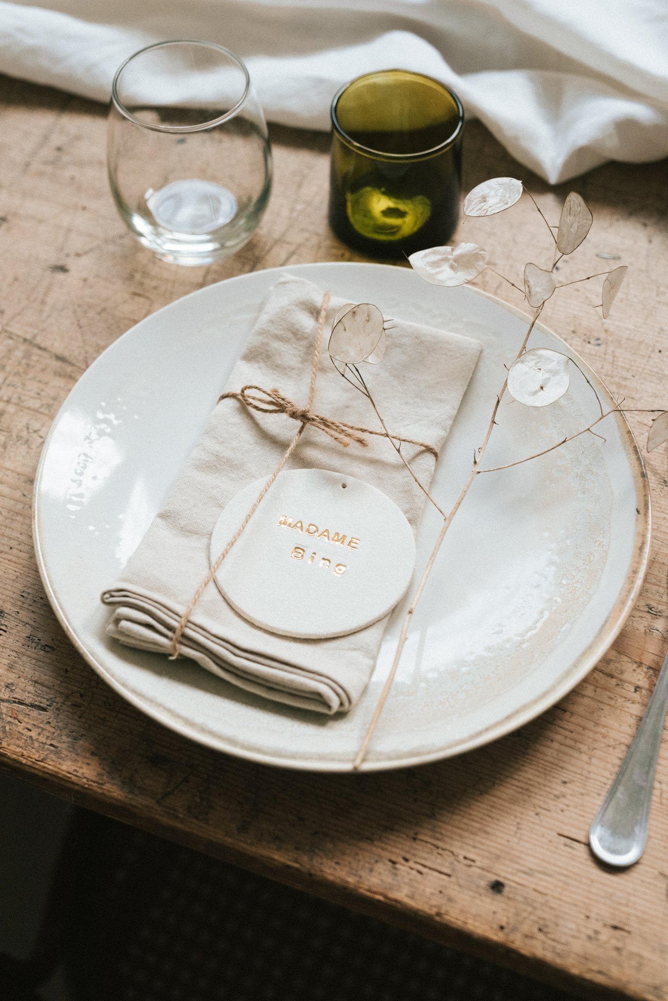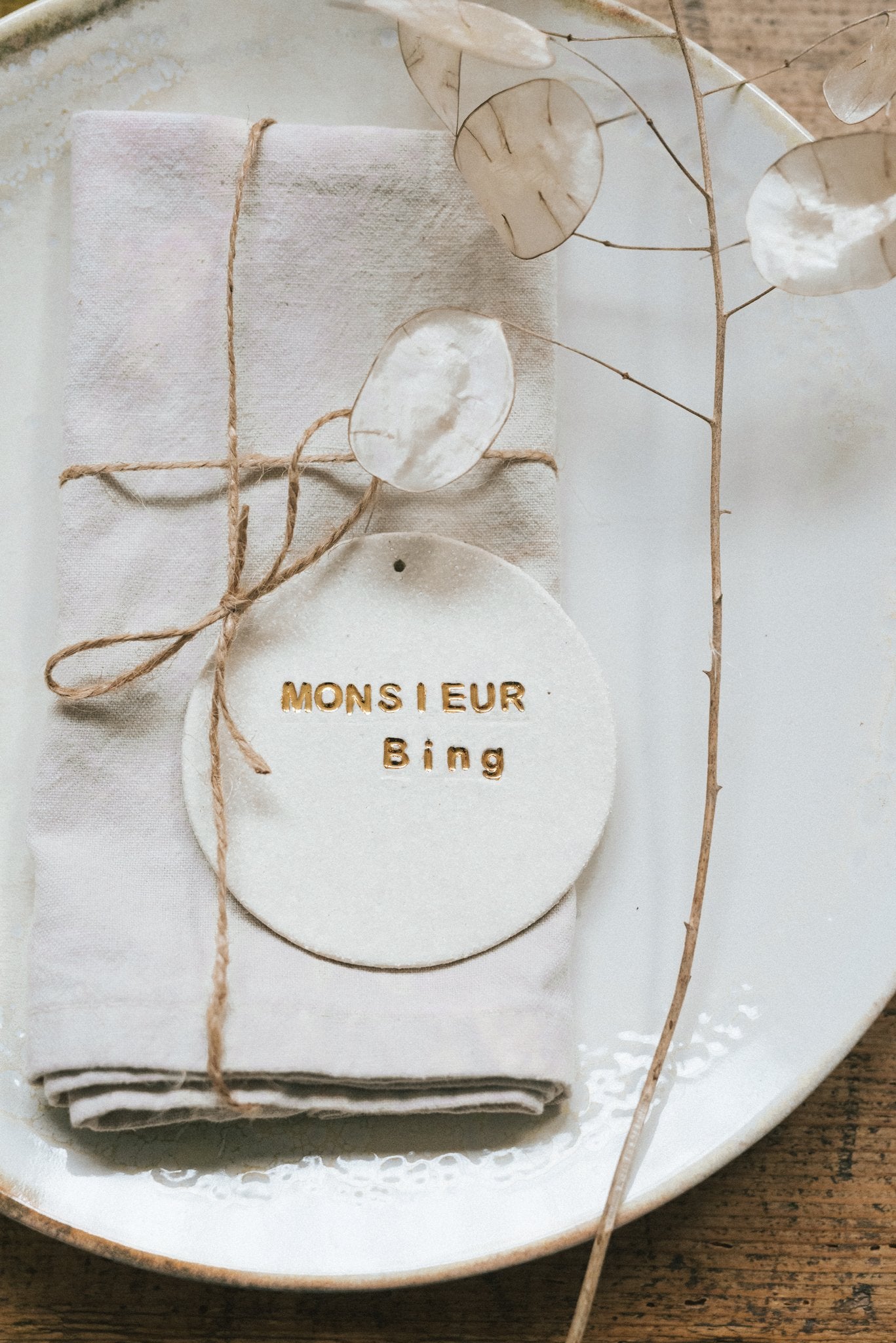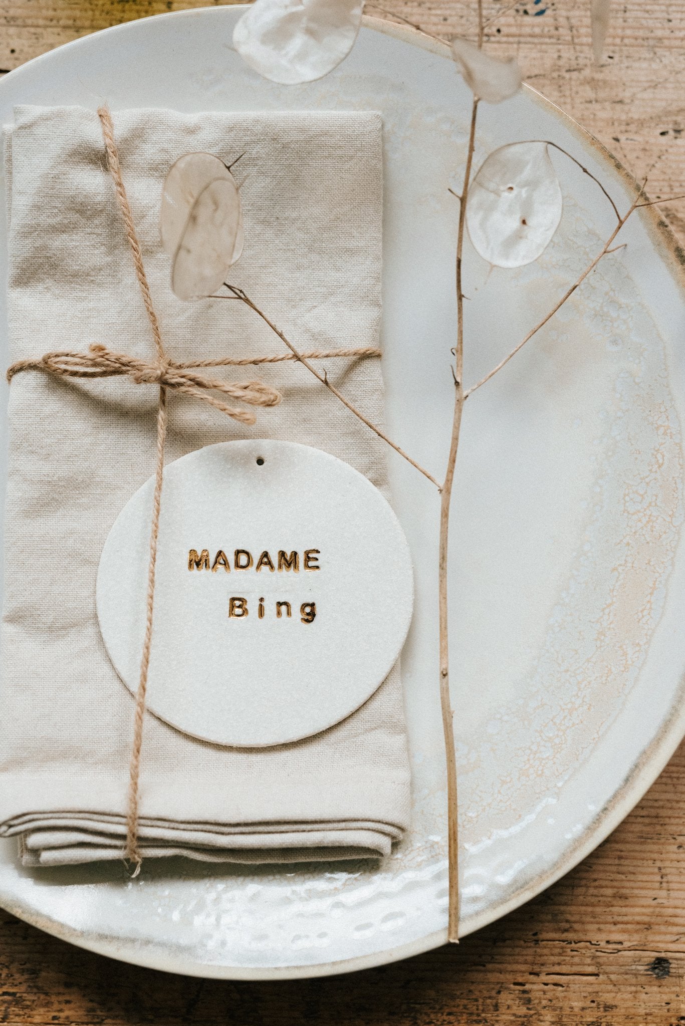Les lettres sont tatouées par impression sur la terre crue. Après séchage, la pièce part en cuisson à 960°C. Ensuite j’émaille en transparent brillant l’intérieur des lettres pour mettre en avant le contraste du des lettres brillantes et de la plaquette brut. Cuisson à 1260°. Pour finir, je peins à la main le coeur et les lettres à l’or fin et cuits une dernière fois à 800°