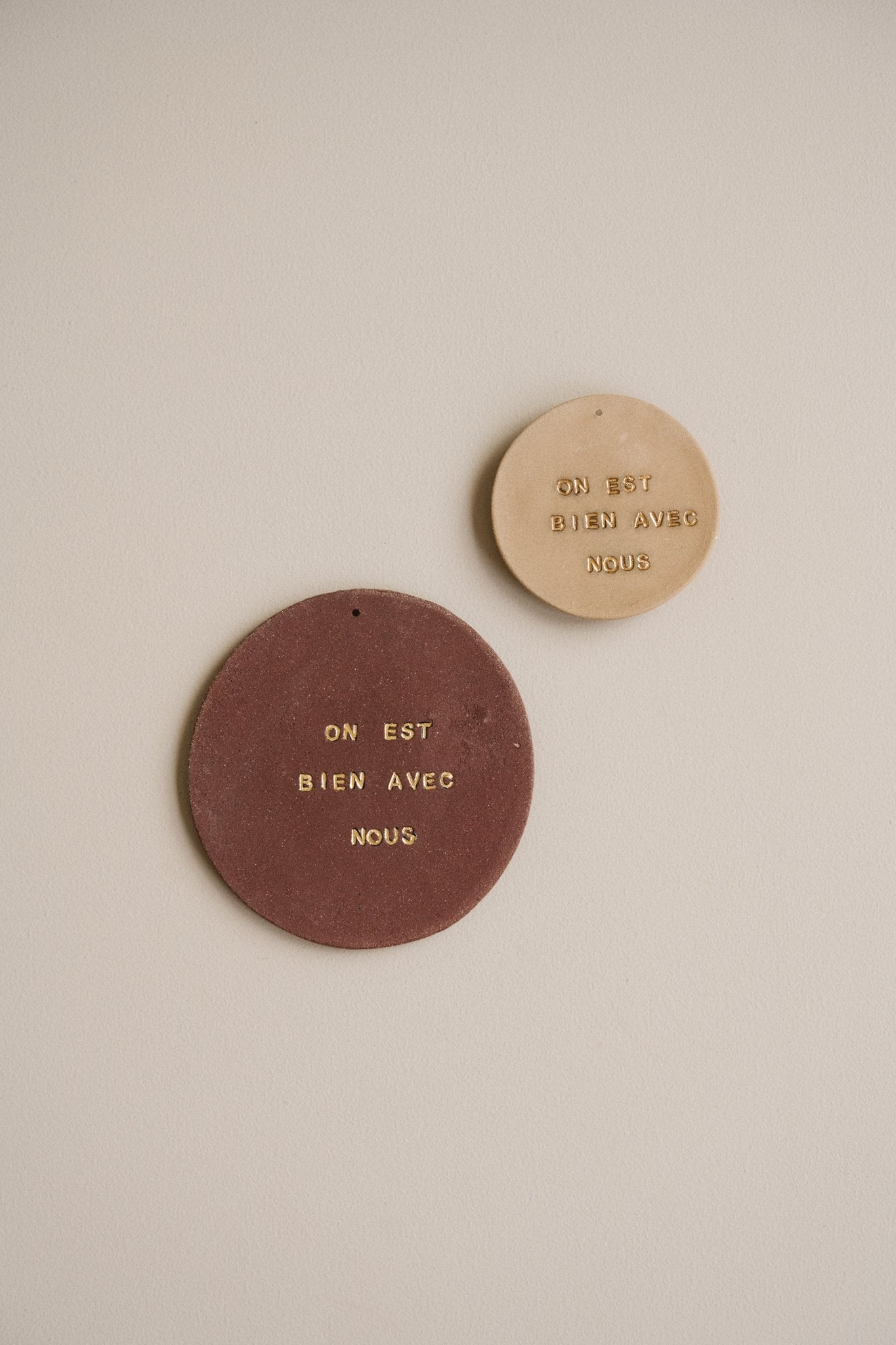 Les lettres sont tatouées par impression sur la terre crue. Après séchage, la pièce part en cuisson à 960°C. Ensuite j’émaille en transparent brillant l’intérieur des lettres pour mettre en avant le contraste du des lettres brillantes et de la plaquette brut. Cuisson à 1260°. Pour finir, je peins à la main le coeur et les lettres à l’or fin et cuits une dernière fois à 800°