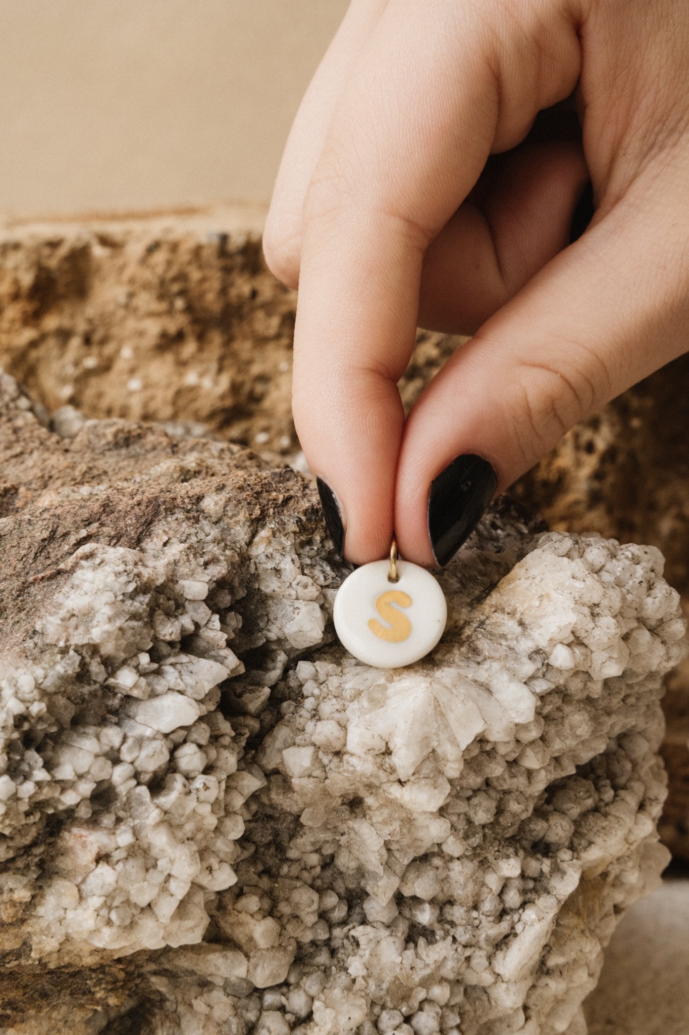Ce pendentif est réalisé en porcelaine blanche puis formée en rond. Chaque lettre est ensuite tatoué par impression.