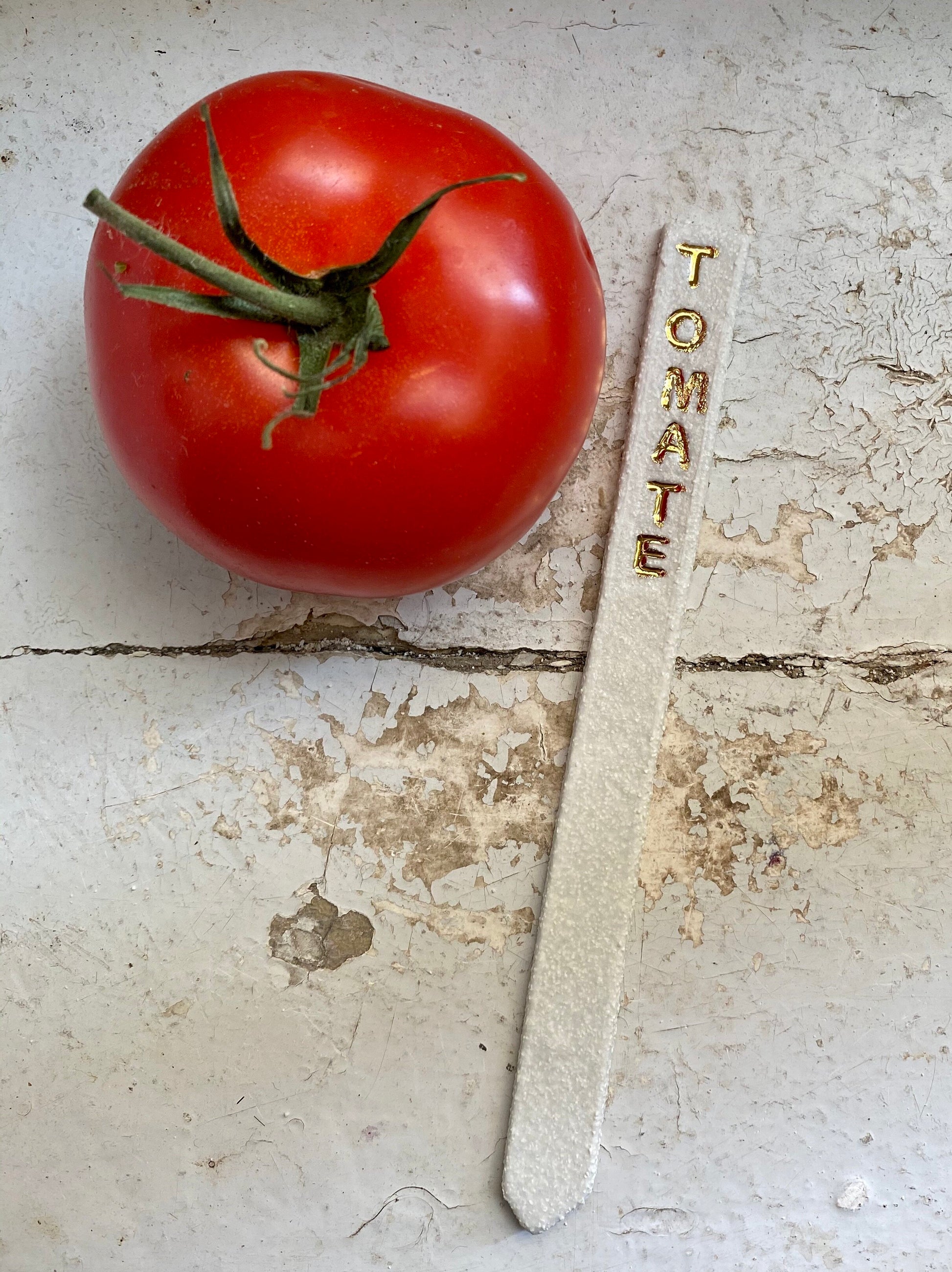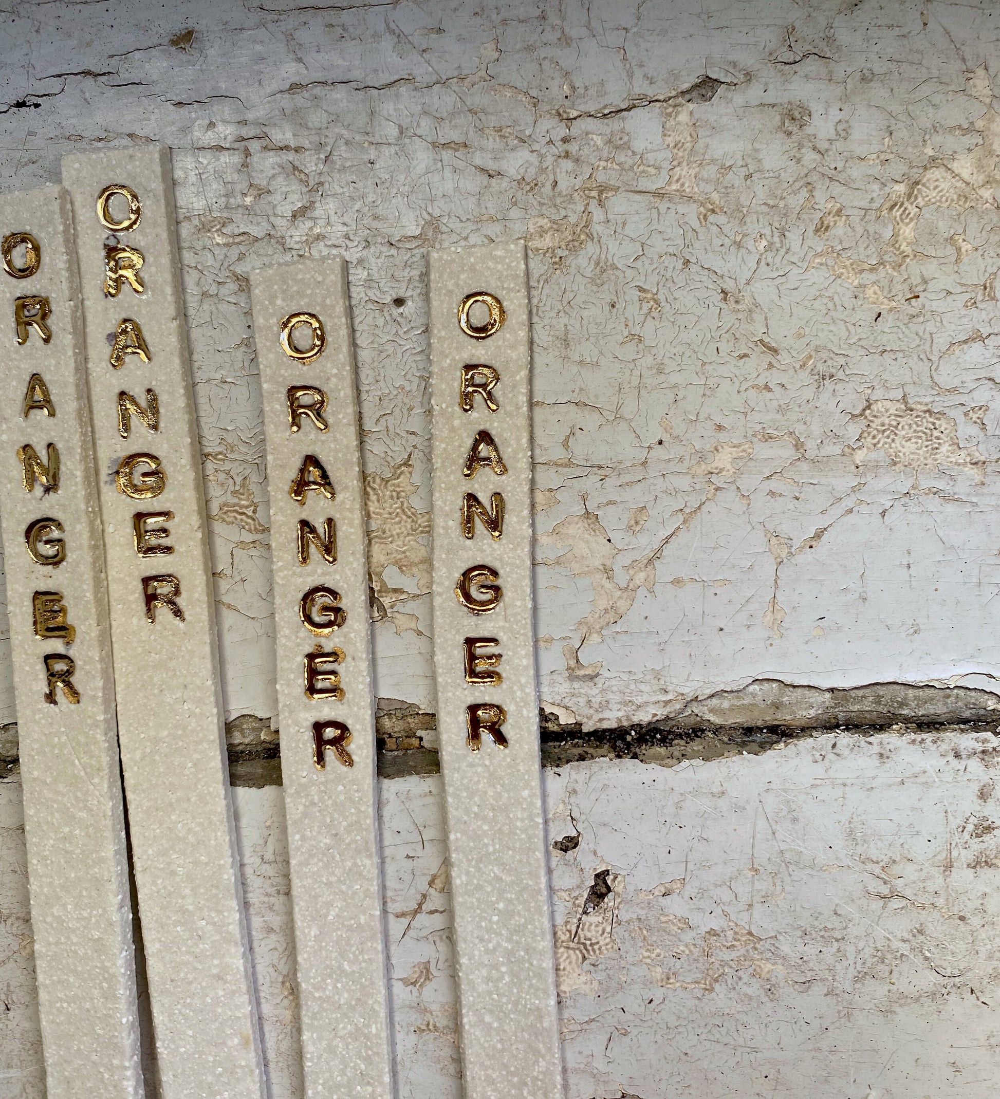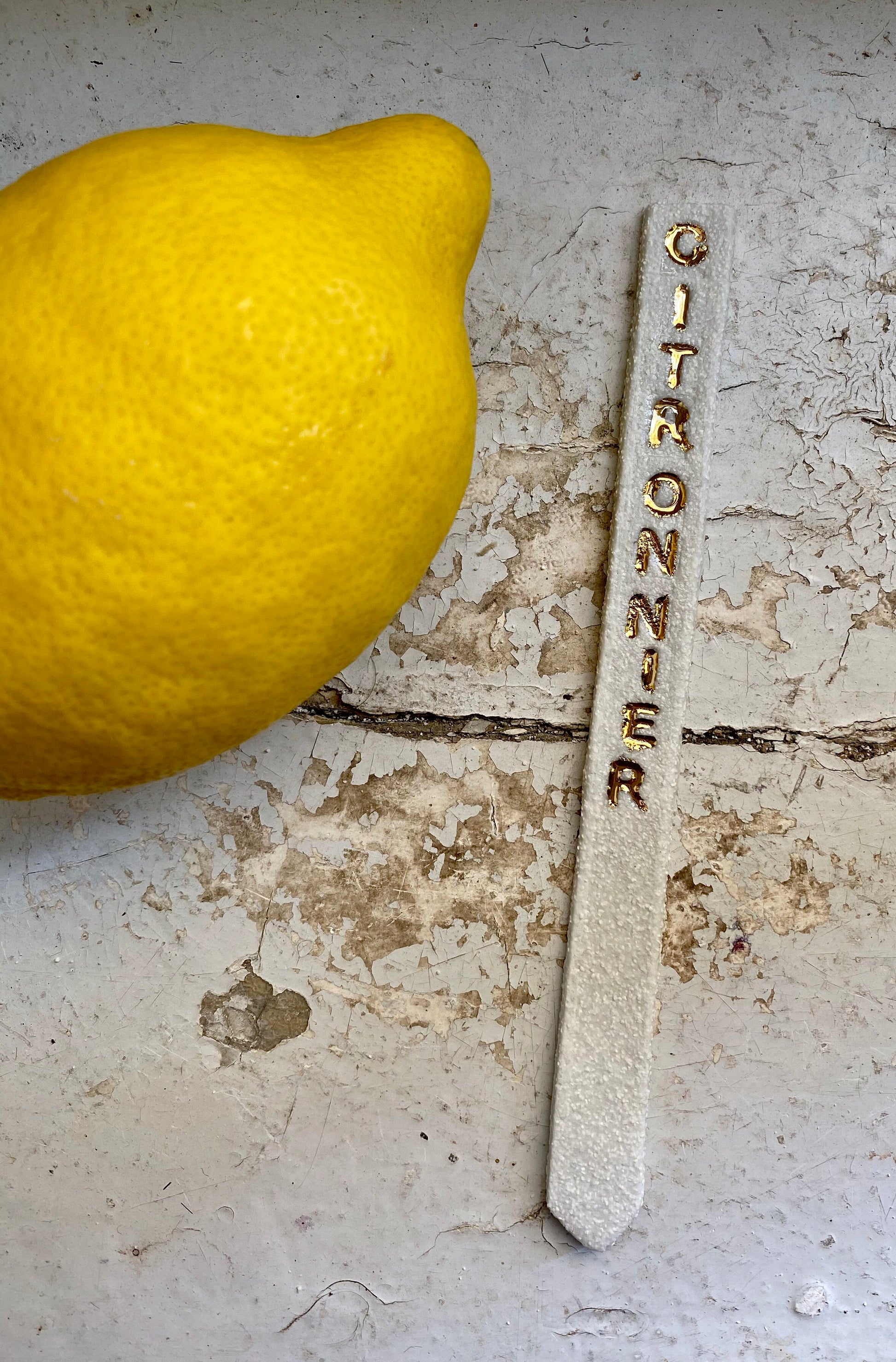 Pique réalisé en porcelaine chamottée. Les mots sont ensuite tatoués par impression sur la terre crue et cuisson à 960°. Ensuite j’émaille en transparent brillant l’intérieur des lettres pour mettre en avant le contraste des lettres brillantes et de la plaquette brut. Cuisson à 1260°. Pour finir, je peins à la main chaque lettre à l’or fin et cuits une dernière fois à 800°.