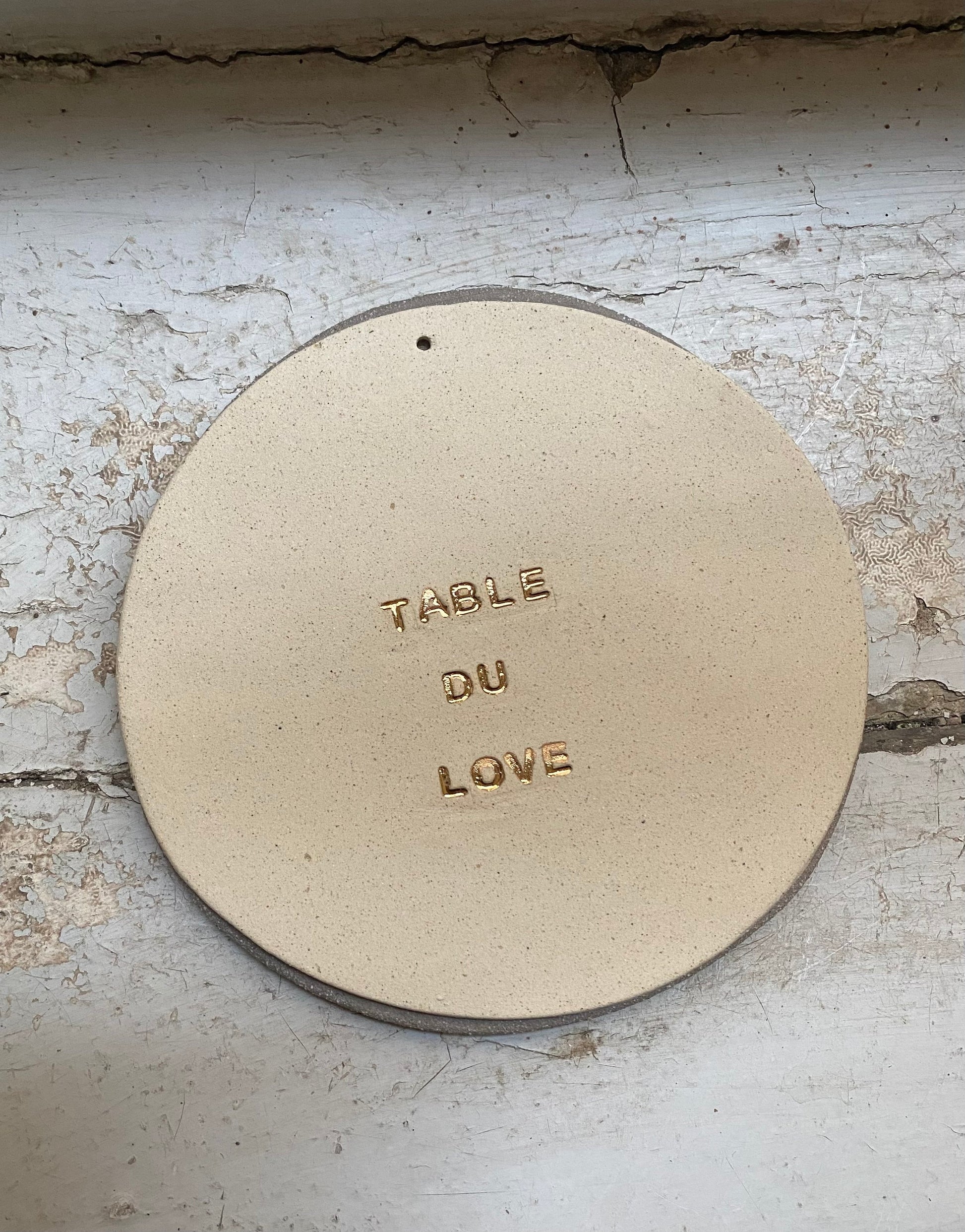 Les lettres sont tatouées par impression sur la terre crue. Après séchage, la pièce part en cuisson à 960°C. Ensuite j’émaille en transparent brillant l’intérieur des lettres pour mettre en avant le contraste du des lettres brillantes et de la plaquette brut. Cuisson à 1260°. Pour finir, je peins à la main le coeur et les lettres à l’or fin et cuits une dernière fois à 800°