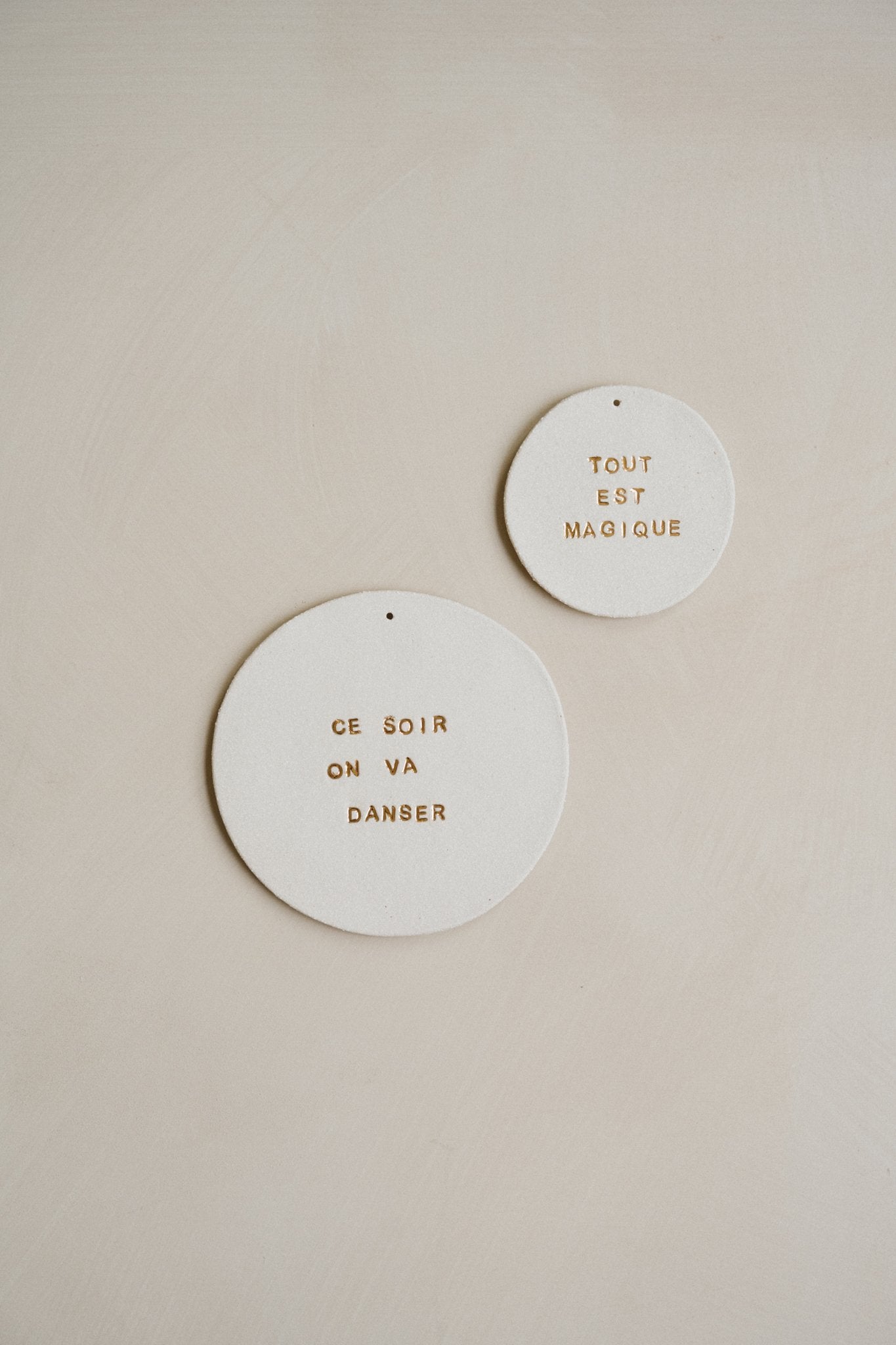 Les lettres sont tatouées par impression sur la terre crue. Après séchage, la pièce part en cuisson à 960°C. Ensuite j’émaille en transparent brillant l’intérieur des lettres pour mettre en avant le contraste du des lettres brillantes et de la plaquette brut. Cuisson à 1260°. Pour finir, je peins à la main le coeur et les lettres à l’or fin et cuits une dernière fois à 800°