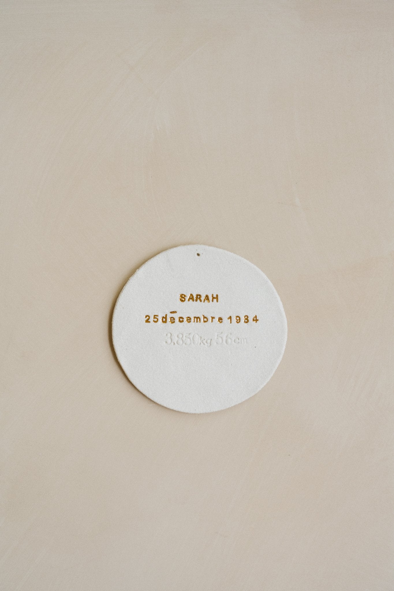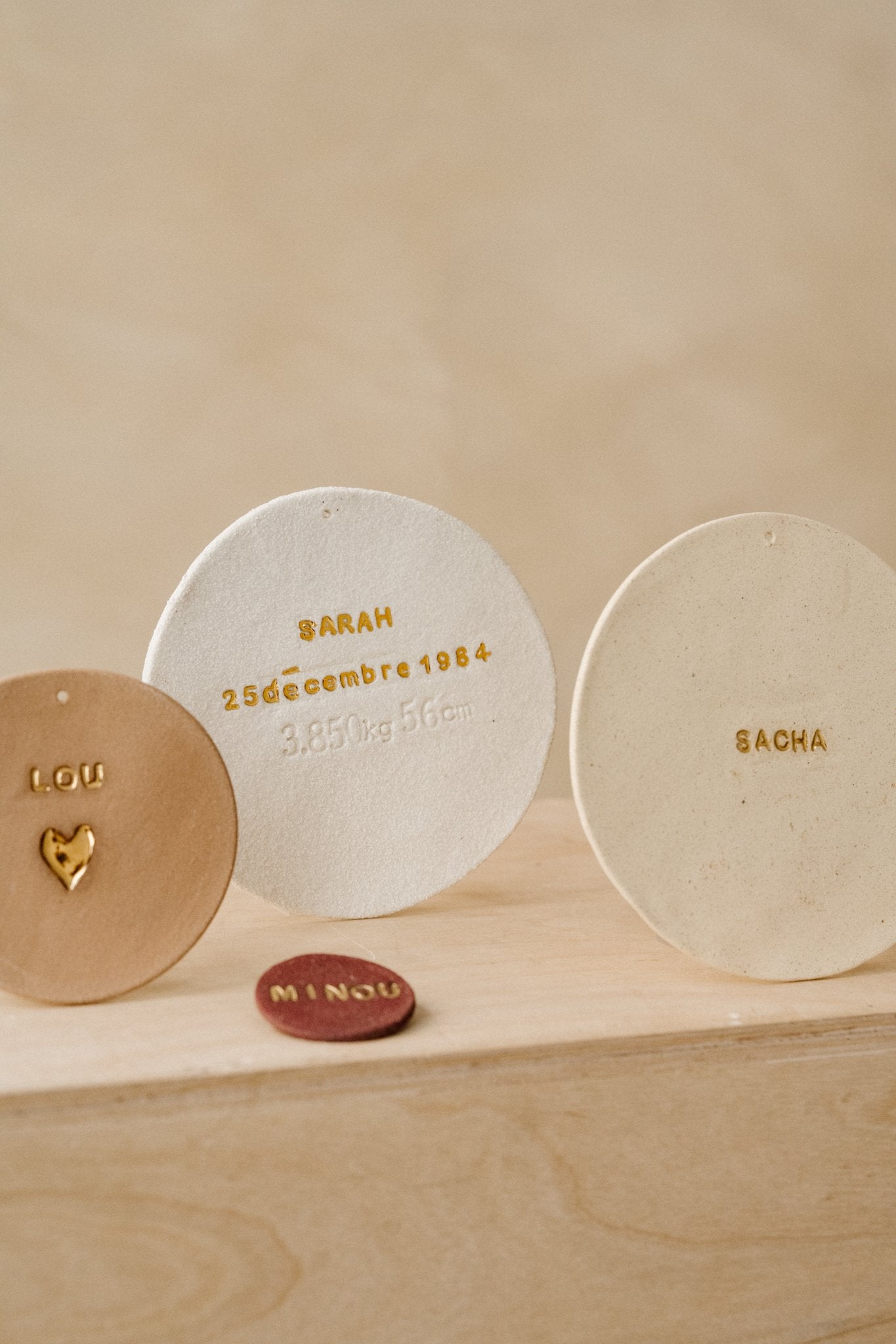 Les lettres sont tatouées par impression sur la terre crue. Après séchage, la pièce part en cuisson à 960°C. Ensuite j’émaille en transparent brillant l’intérieur des lettres pour mettre en avant le contraste du des lettres brillantes et de la plaquette brut. Cuisson à 1260°. Pour finir, je peins à la main le coeur et les lettres à l’or fin et cuits une dernière fois à 800°