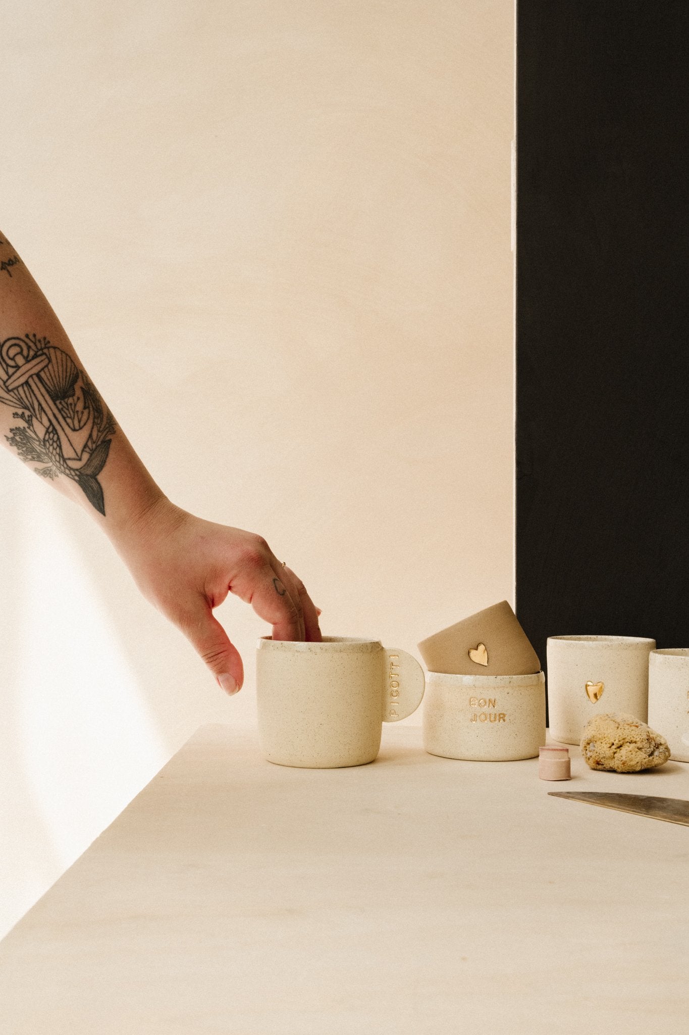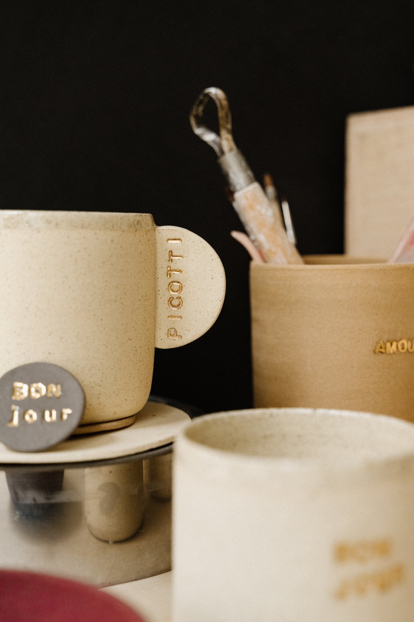 Les mots sont tatoués par impression sur la terre crue et cuisson à 960°. Ensuite j’émaille en transparent brillant l’intérieur de la tasse et les lettres pour mettre en avant le contraste des lettres brillantes et de la tasse brut. Cuisson à 1260°. Pour finir, je peins à la main chaque lettre à l’or fin et cuits une dernière fois à 800°.