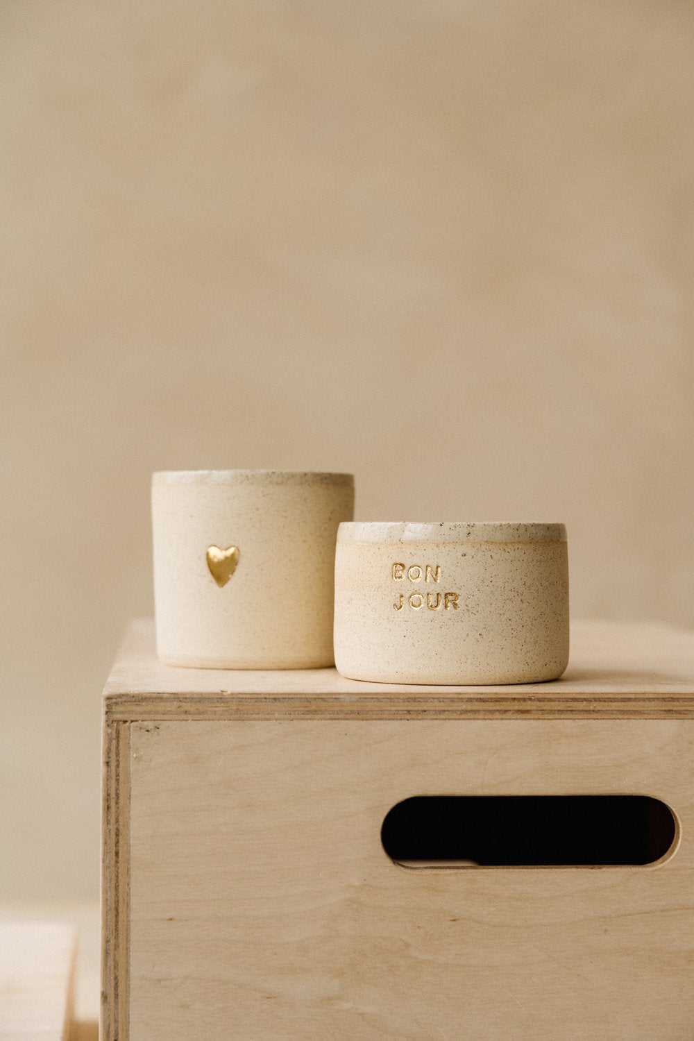 Les mots sont tatoués par impression sur la terre crue et cuisson à 960°. Ensuite j’émaille en transparent brillant l’intérieur l’intérieur de la tasse et les lettres pour mettre en avant le contraste des lettres brillantes et de la plaquette brut. Cuisson à 1260°. Pour finir, je peins à la main chaque lettre à l’or fin et cuits une dernière fois à 800°.