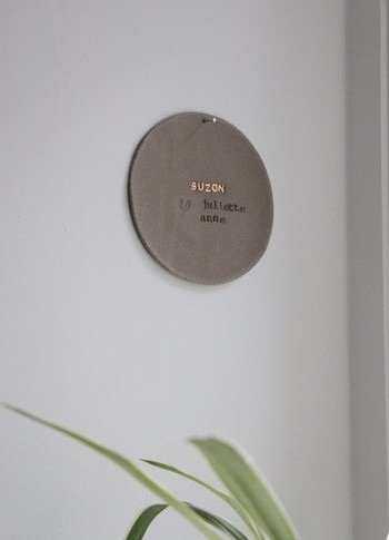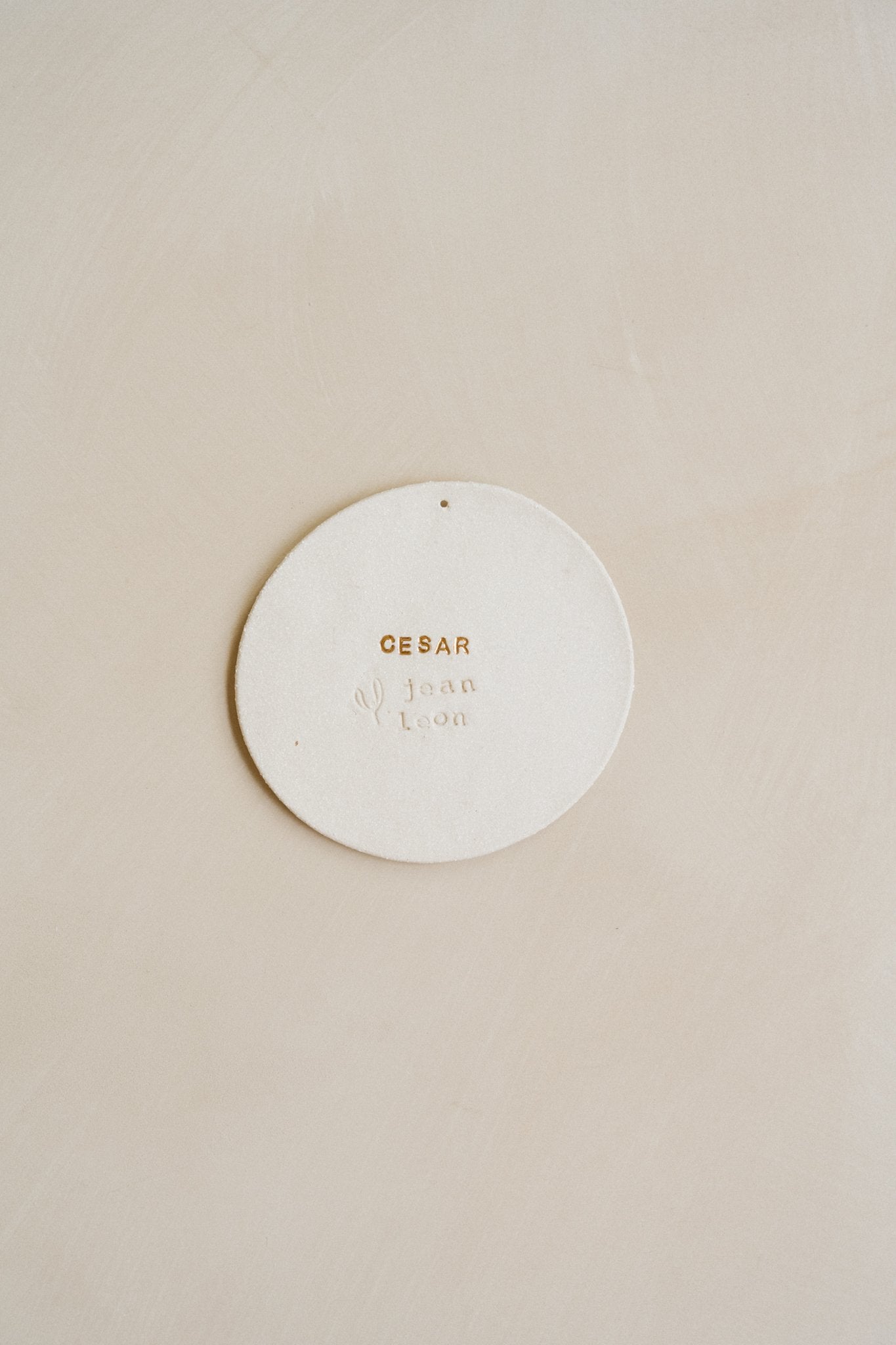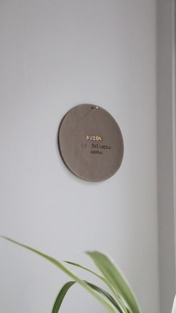 Les lettres sont tatouées par impression sur la terre crue. Après séchage, la pièce part en cuisson à 960°C. Ensuite j’émaille en transparent brillant l’intérieur des lettres pour mettre en avant le contraste du des lettres brillantes et de la plaquette brut. Cuisson à 1260°. Pour finir, je peins à la main le coeur et les lettres à l’or fin et cuits une dernière fois à 800°