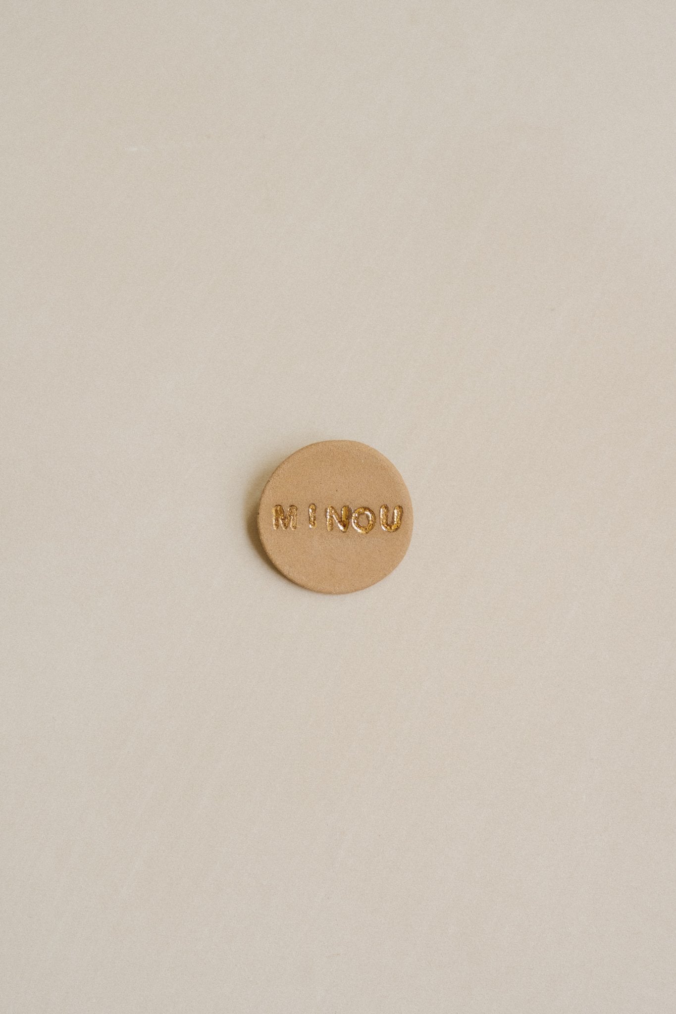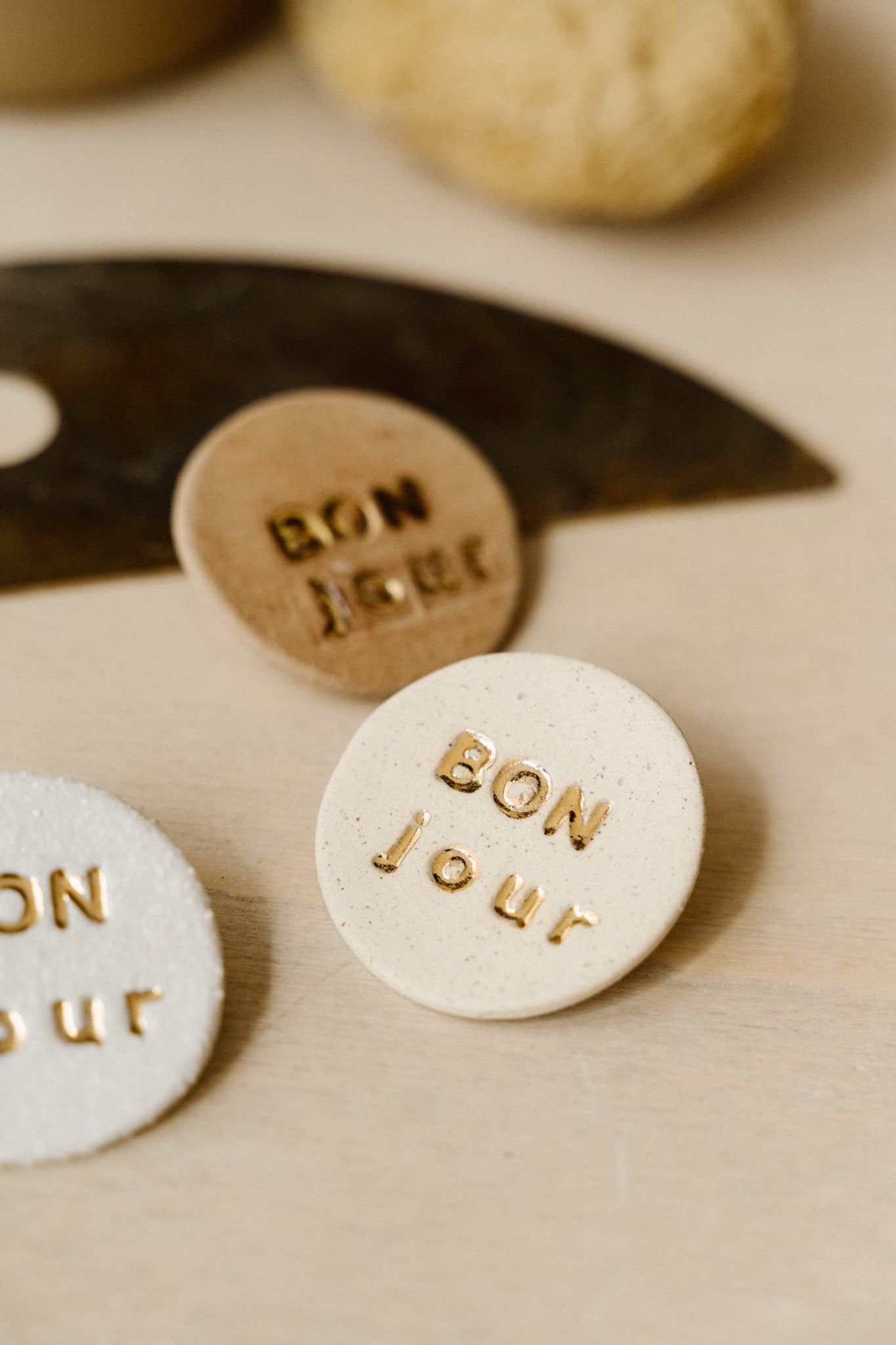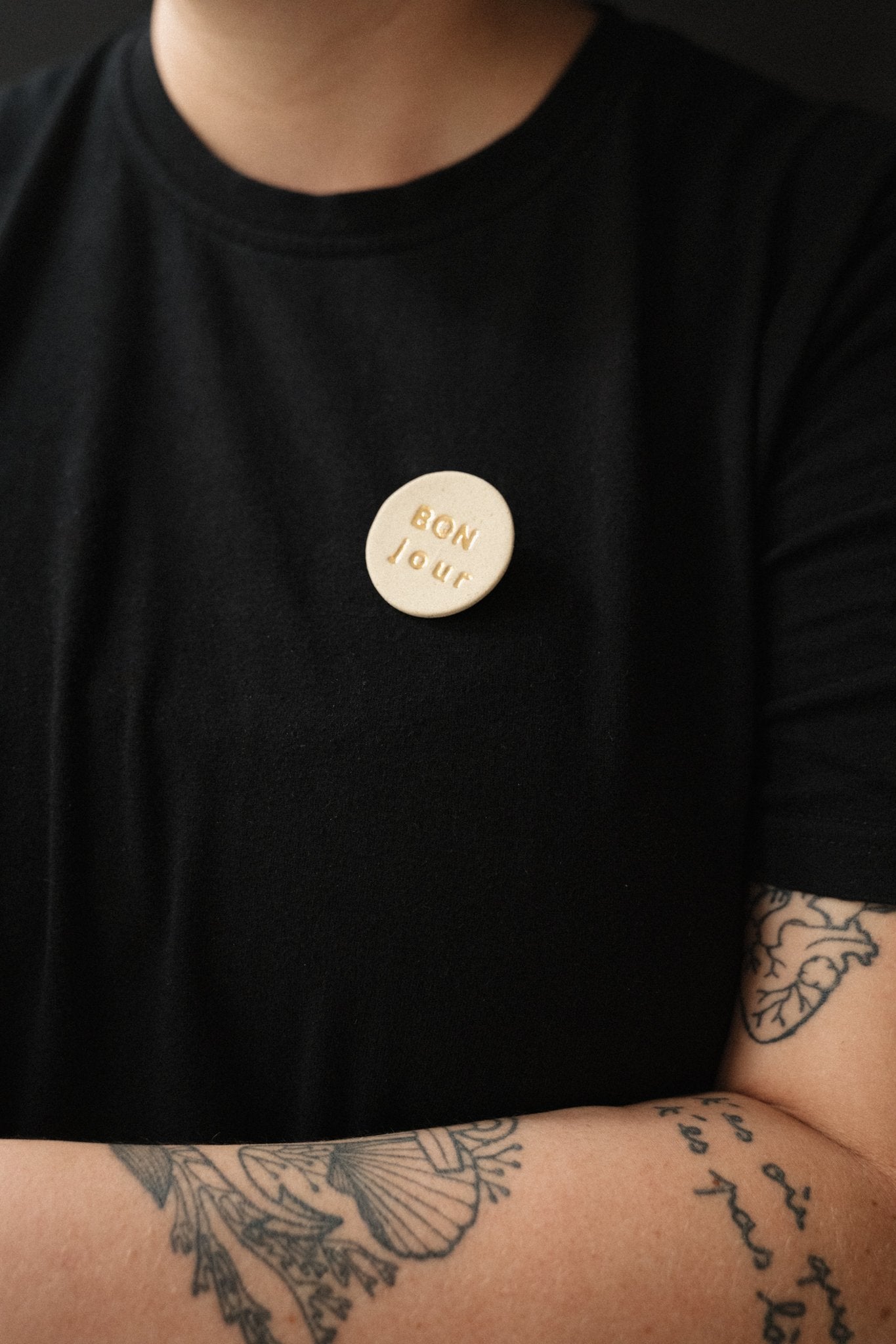 Cette broche est réalisée en porcelaine blanche et grès colorés et formée en rond. Chaque lettre est ensuite tatoué par impression.