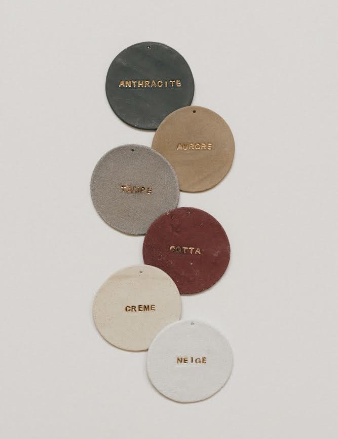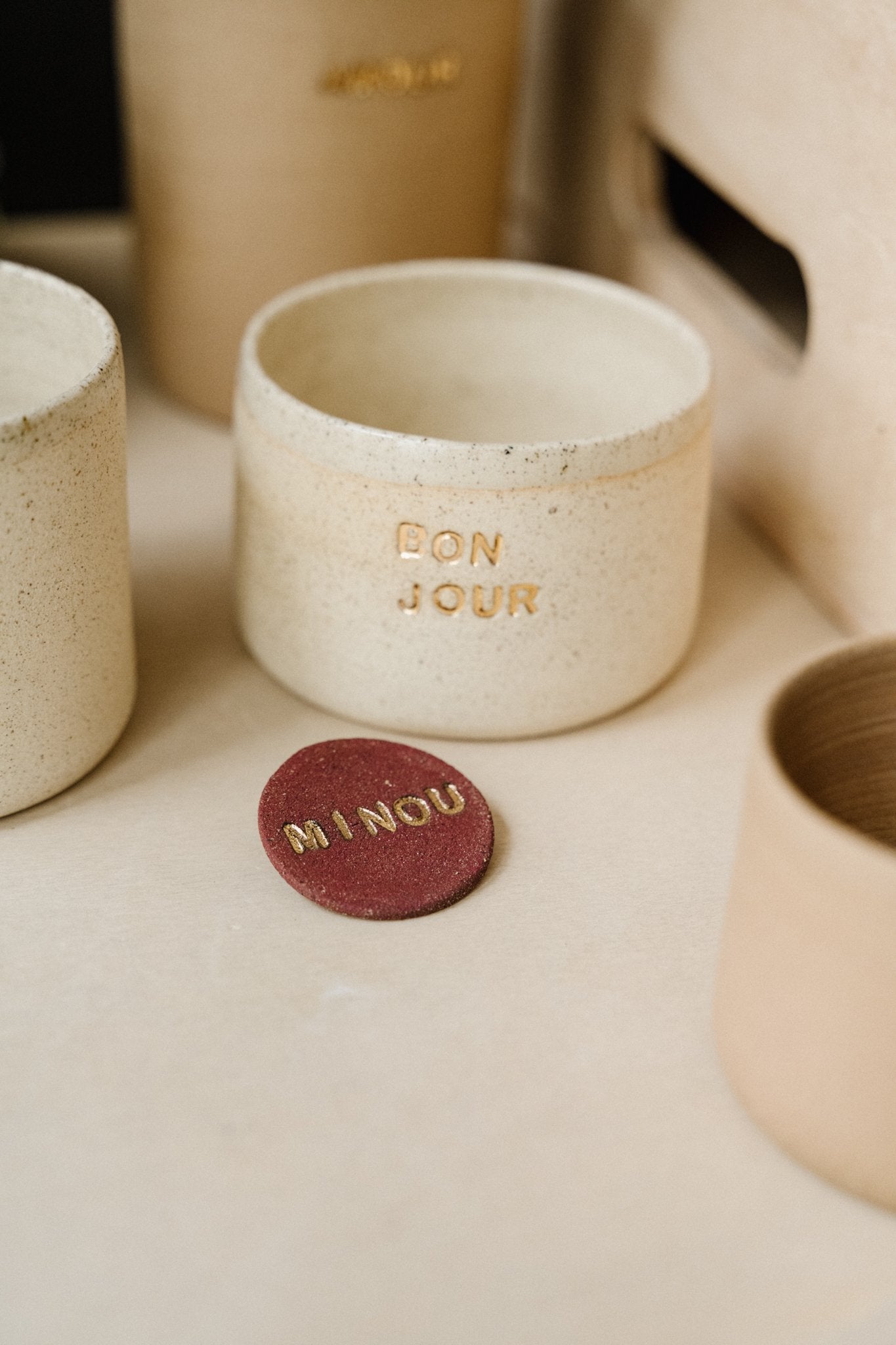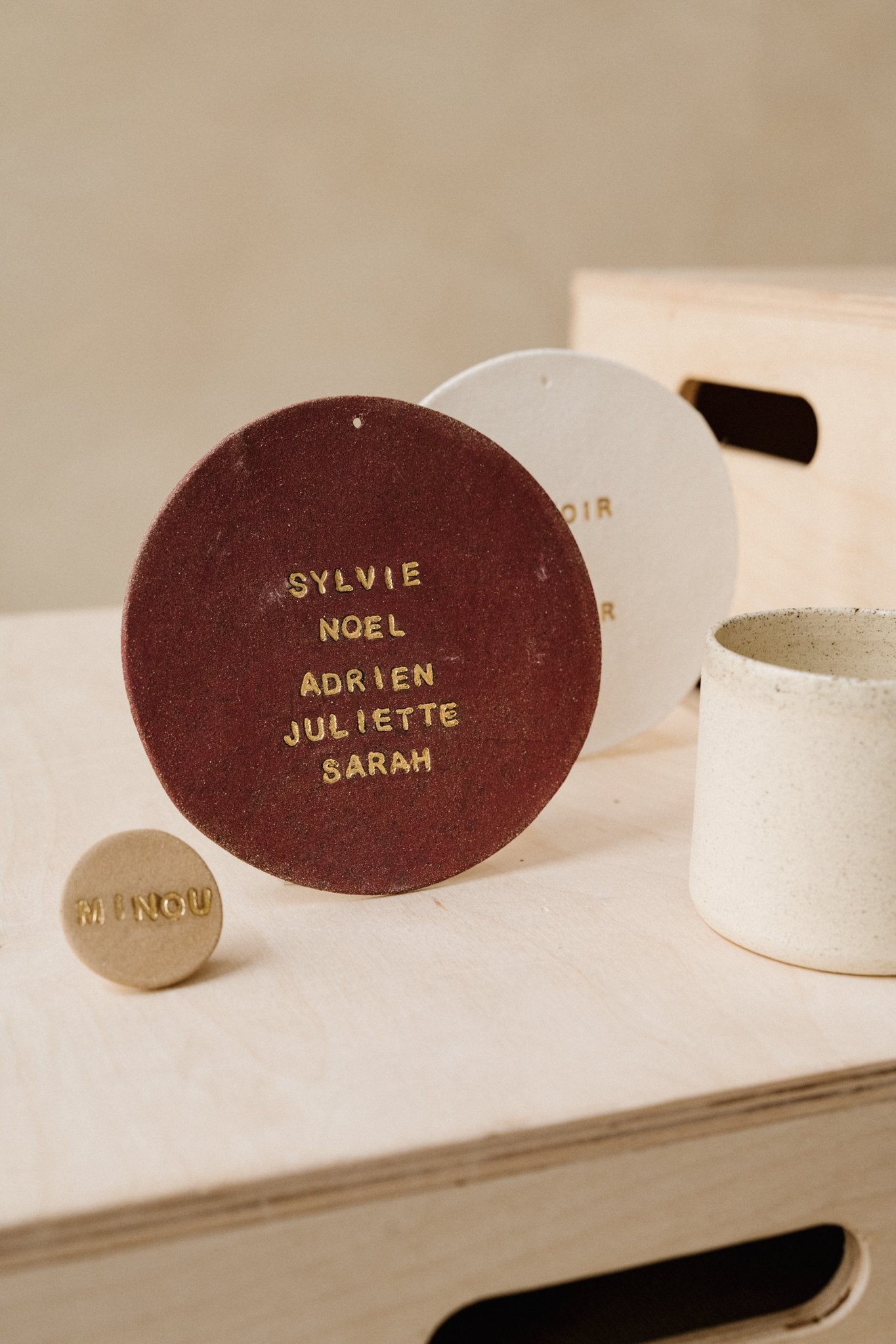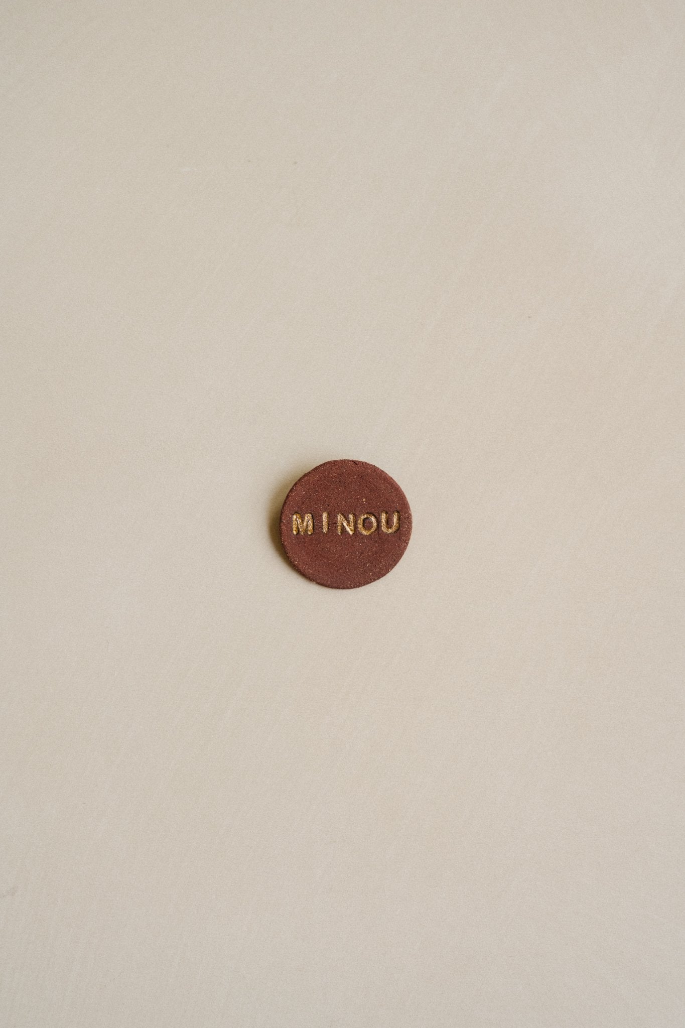 Cette broche est réalisée en porcelaine blanche et grès colorés et formée en rond. Chaque lettre est ensuite tatoué par impression.