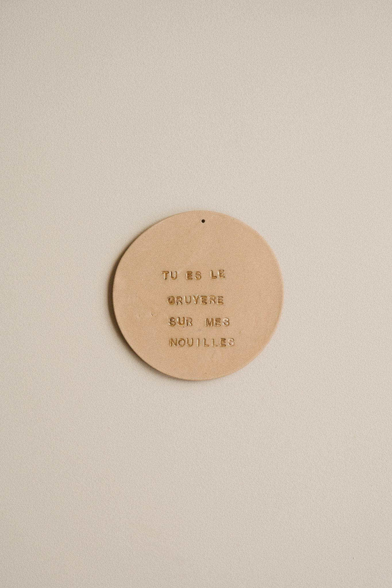 Les lettres sont tatouées par impression sur la terre crue. Après séchage, la pièce part en cuisson à 960°C. Ensuite j’émaille en transparent brillant l’intérieur des lettres pour mettre en avant le contraste du des lettres brillantes et de la plaquette brut. Cuisson à 1260°. Pour finir, je peins à la main le coeur et les lettres à l’or fin et cuits une dernière fois à 800°