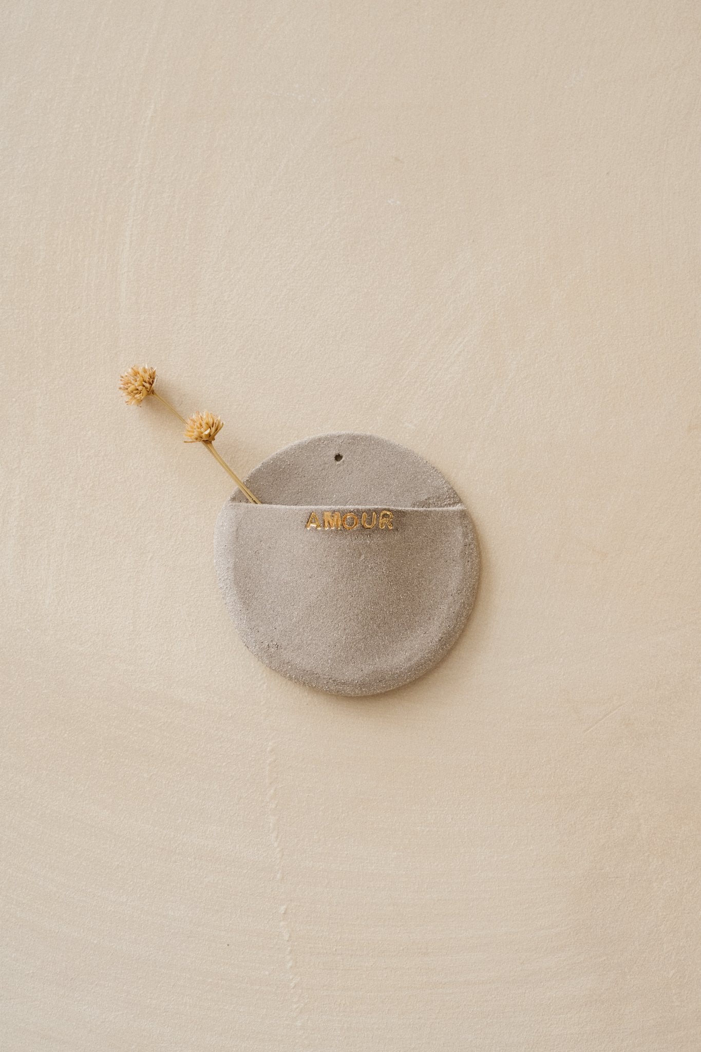 Façonné à la main et cuit une première fois à 960°, ensuite je laisse la terre brut et ajoute une pointe d'émail sur les lettres et cuits à 1260°C. Pour finir, je peins à la main chaque lettre à l'or fin et cuits une dernière fois à 800°