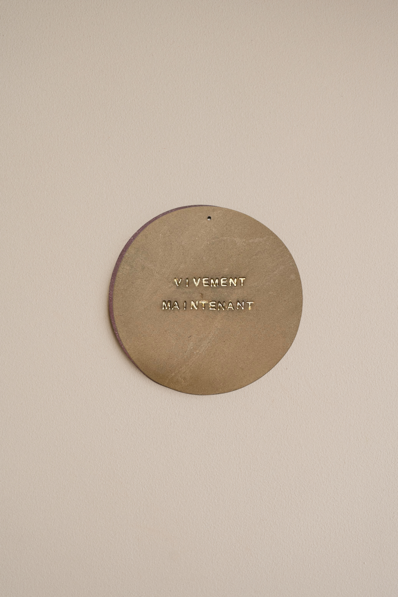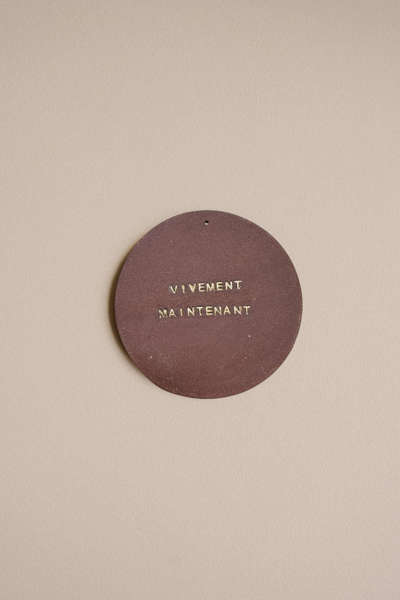 Les lettres sont tatouées par impression sur la terre crue. Après séchage, la pièce part en cuisson à 960°C. Ensuite j’émaille en transparent brillant l’intérieur des lettres pour mettre en avant le contraste des lettres brillantes et de la plaquette brut. Cuisson à 1260°. Pour finir, je peins à la main les lettres à l’or fin et cuits une dernière fois à 800°